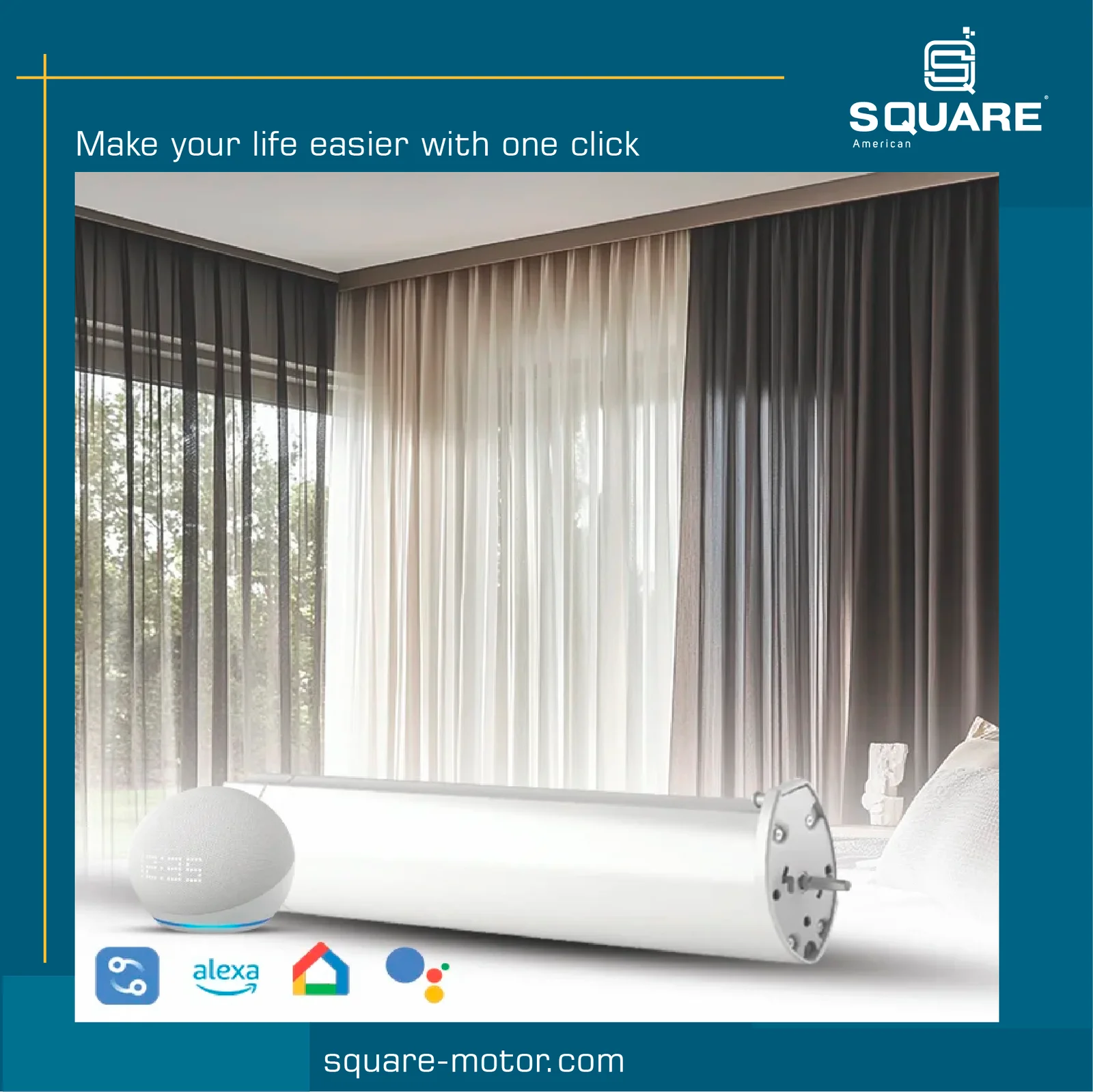 - محرك سكوير هو الخيار المثالي للحصول على تحكم قوي ودقة عالية في الستائر الكبيرة والثقيلة، مما يجعله الخيار الأفضل للمساحات التي تحتاج إلى محرك موثوق وعالي الكفاءة.
